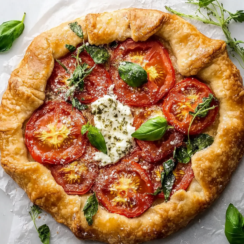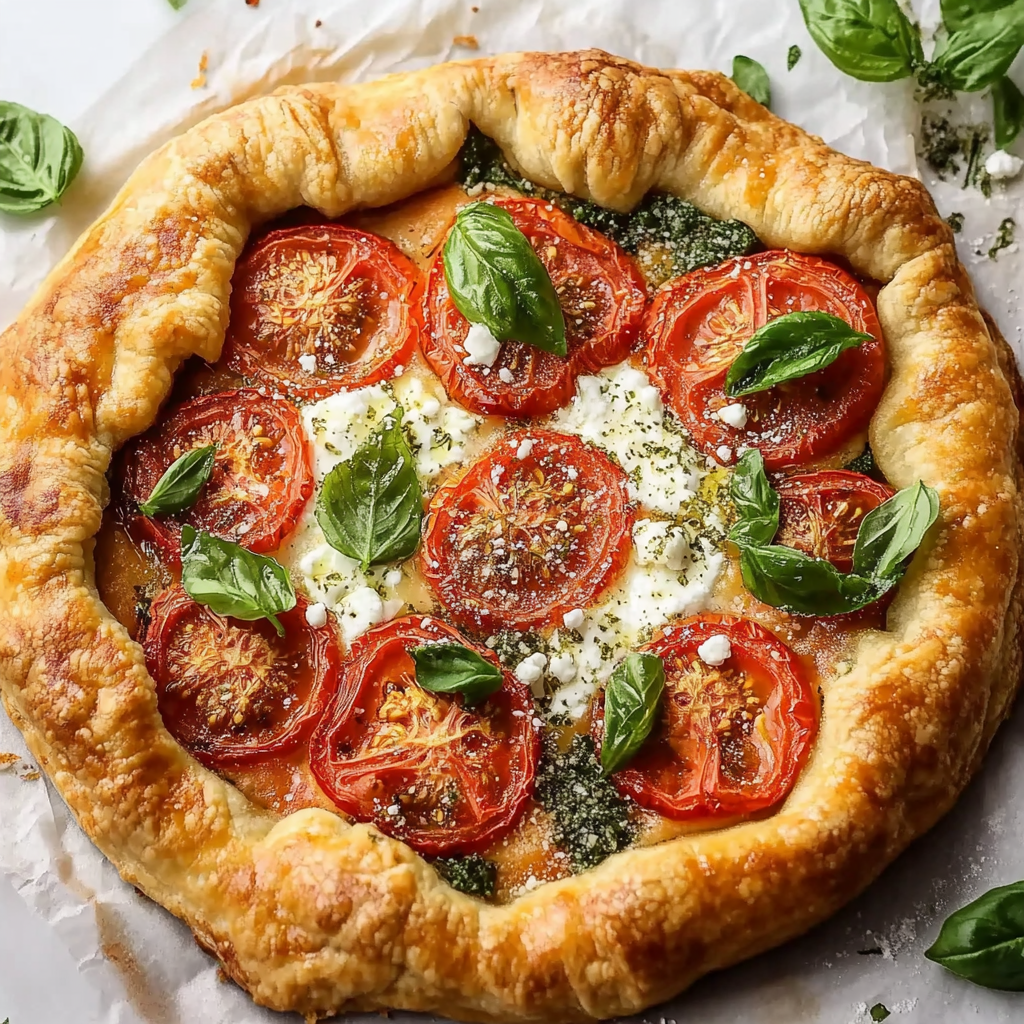 Easy Tomato Basil Galette with Goat Cheese is a delightful and rustic dish that brings the flavors of summer straight to your table. This galette features a flaky, golden-brown crust filled with juicy, ripe tomatoes, creamy goat cheese, and fragrant fresh basil. Whether you’re hosting a brunch, enjoying a light dinner, or serving it as an appetizer at a gathering, this recipe is both simple to prepare and visually stunning. With its vibrant colors and savory taste, it’s sure to impress family and friends alike.