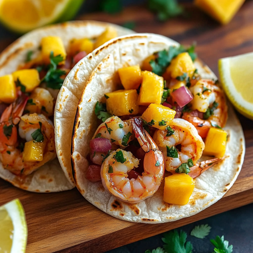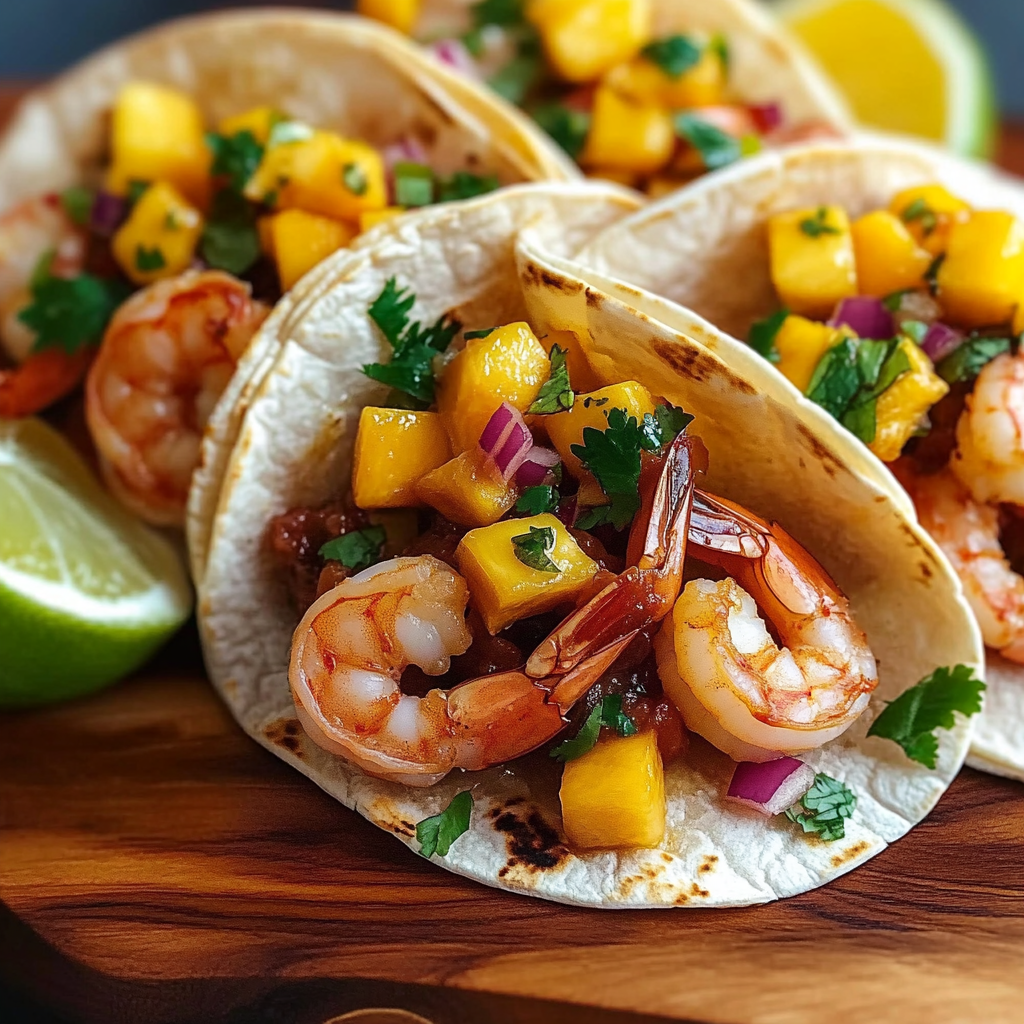 - Assemble tacos by placing shrimp on tortillas, topping with mango salsa and any desired toppings.